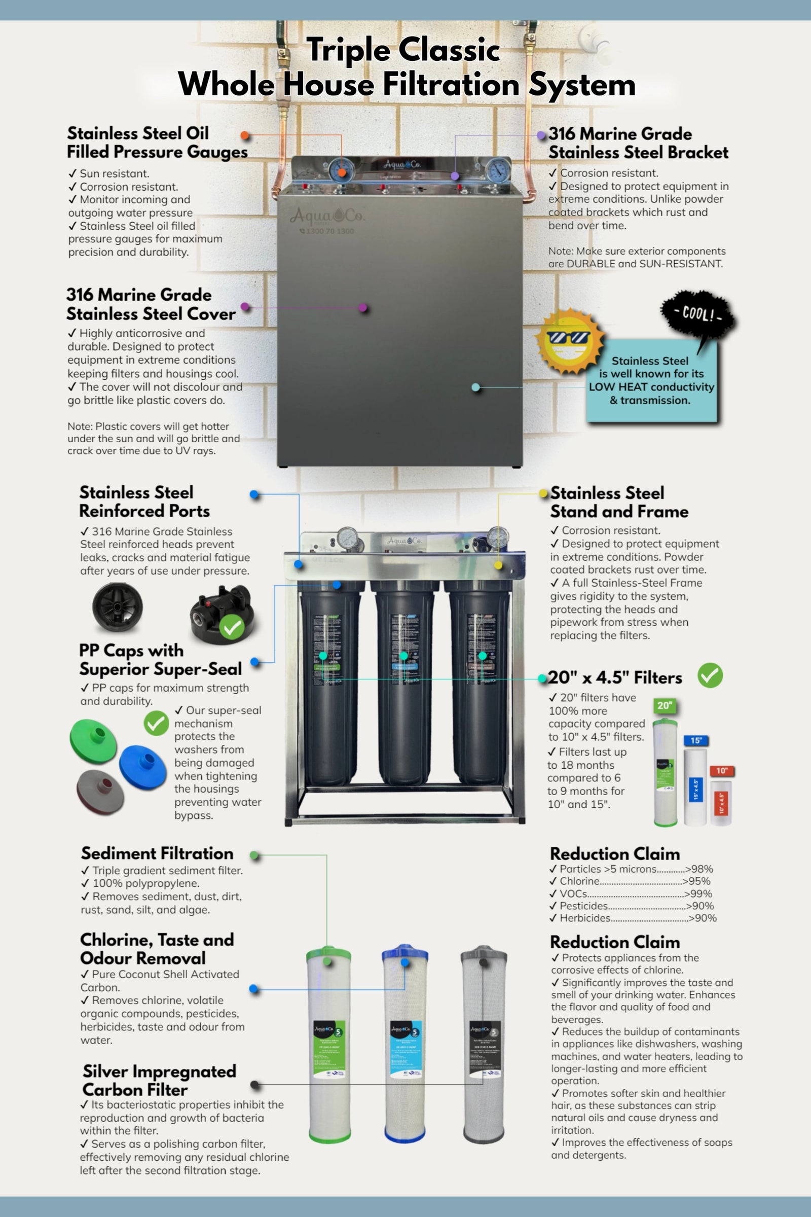 Ensure your family's health with the AquaCo Classic Three Stage Whole House Water Filter System. Say goodbye to bad odors and unpleasant-tasting water.